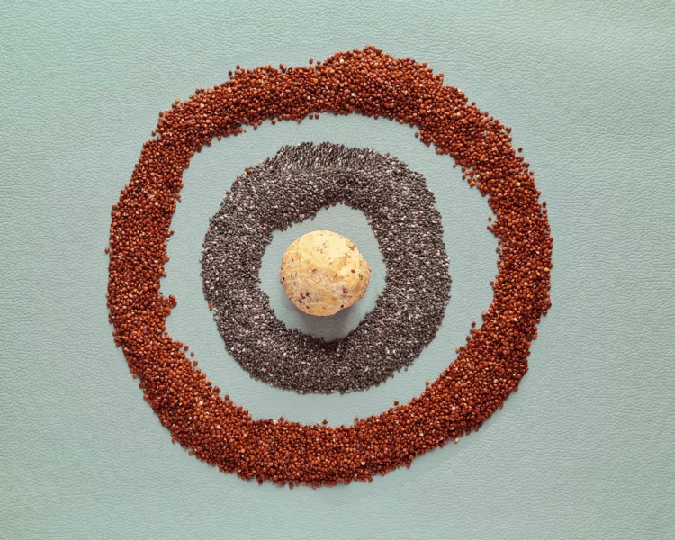 Desenvolvemos fornecedores com certificação de gluten free. Os melhores grãos também dependem de sua origem, como a quinoa vermelha 100% peruana. O preparo dos grãos começa um dia antes. São inspecionados, peneirados, lavados e secados. Cuidado e amor em cada detalhe.