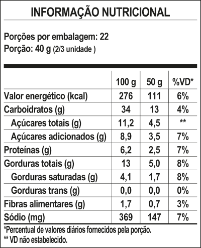 Fécula de mandioca, leite pasteurizado integral, goiabada (polpa de goiabada, açúcar e acidulante ácido cítrico), ovos, queijo artesanal mineiro, óleo de girassol e sal.