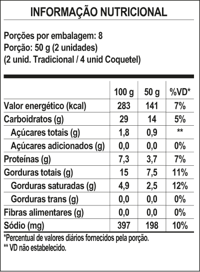 Fécula de mandioca, leite pasteurizado integral, queijo minas artesanal, ovos, óleo de girassol e sal.